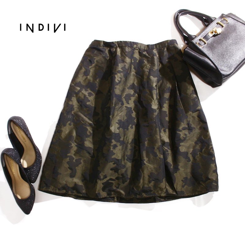 - 美品 インディヴィ INDIVI 株) ワールド 迷彩柄 ジャガード ギャザー ナイロン フレアスカート 大きいサイズ 13号 カーキグリーン スカート