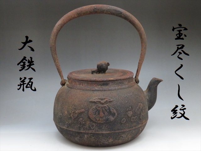 - ◆◇時代物 清寿堂 宝尽くし紋 宝槌摘鉄蓋 大鉄瓶 特大 重量 4kg 南部鉄器 湯沸 煎茶道具 水漏れ無し◇◆