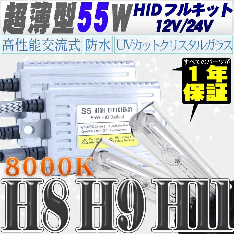 - 高性能 薄型HIDキット 55W H11/H8 8000K 12V/24V 【交流式バラスト&クリスタルガラスバーナー】