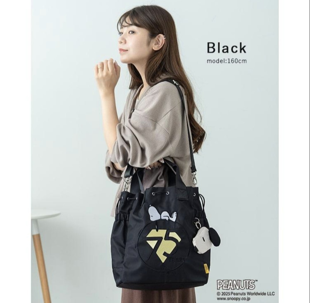 - PEANUTS スヌーピー 75周年 2WAYショルダーバッグ フェイス型ミニポーチ付き ブラック
