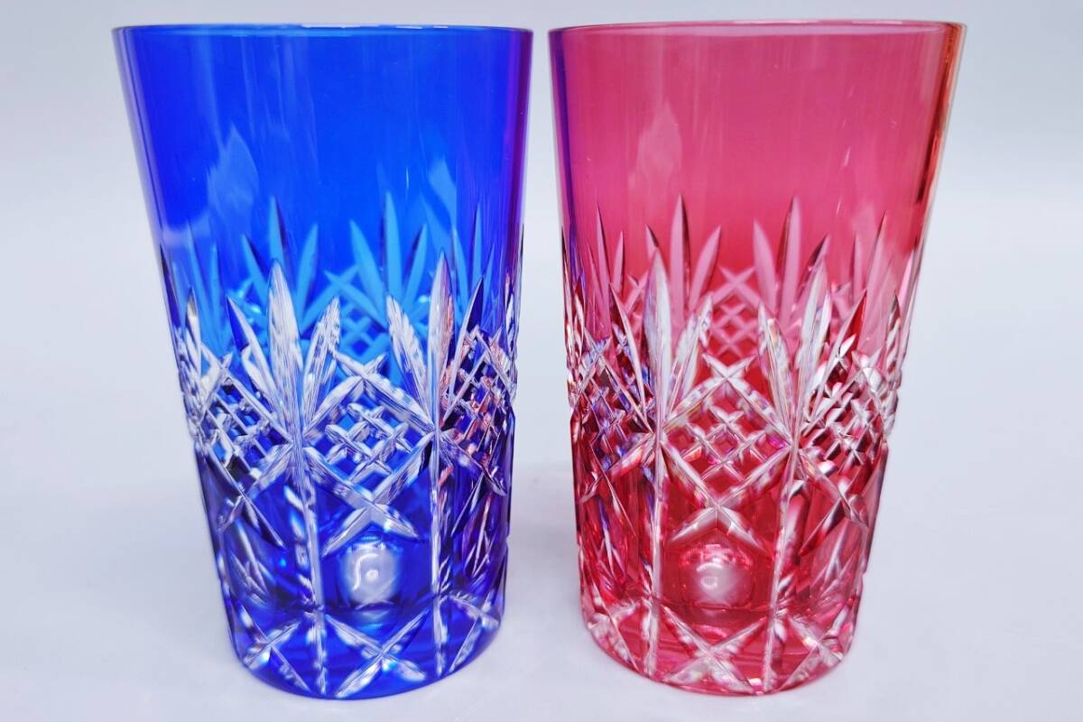 > 江戸切子 クリスタルグラス ペア 赤 青 色被 切子グラス ガラス工芸 ペアグラス 酒器グラス インテリア 工芸品 コレクション 工芸ガラス