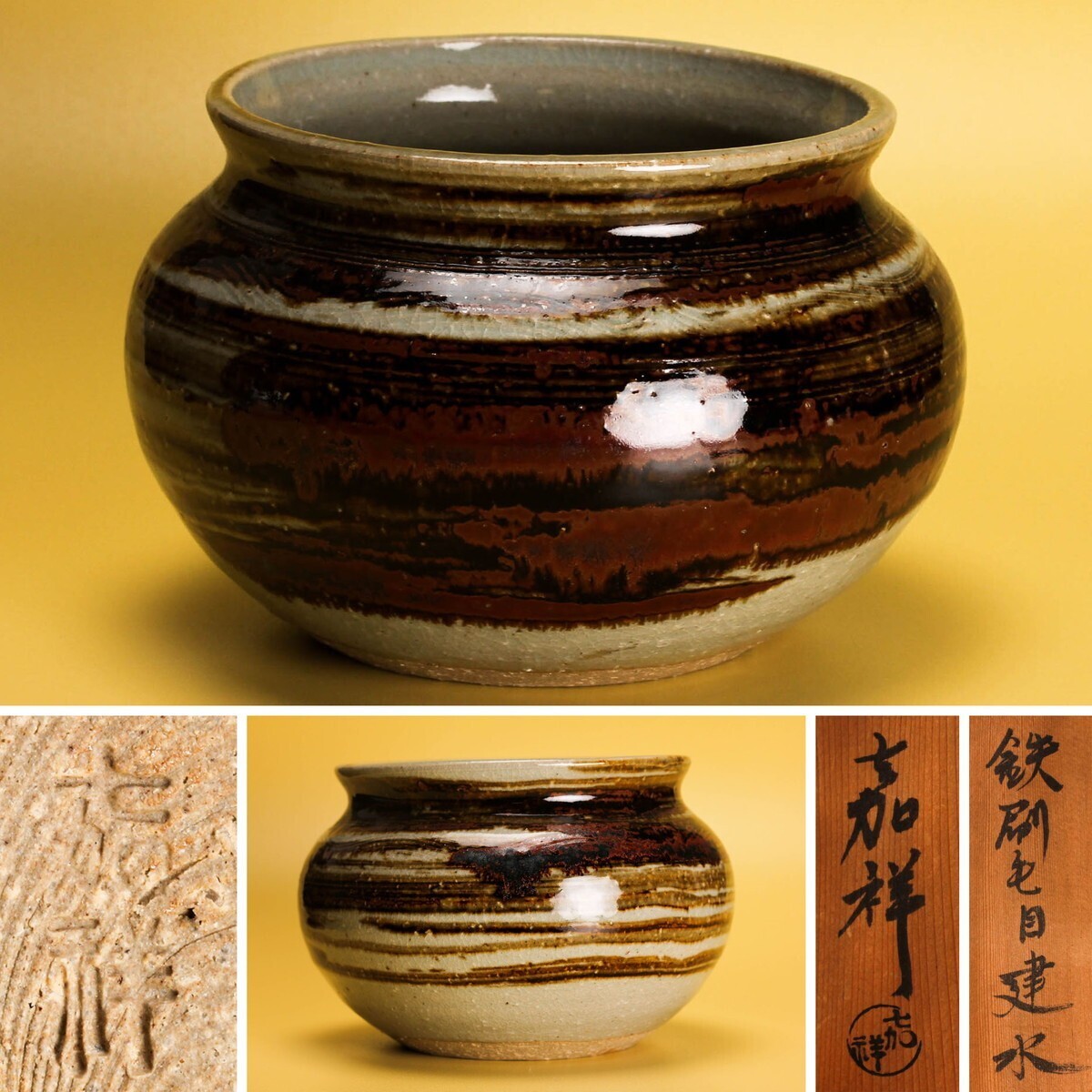 - 森岡嘉祥 鉄刷毛目建水 共箱 共布 茶道具 本物保証