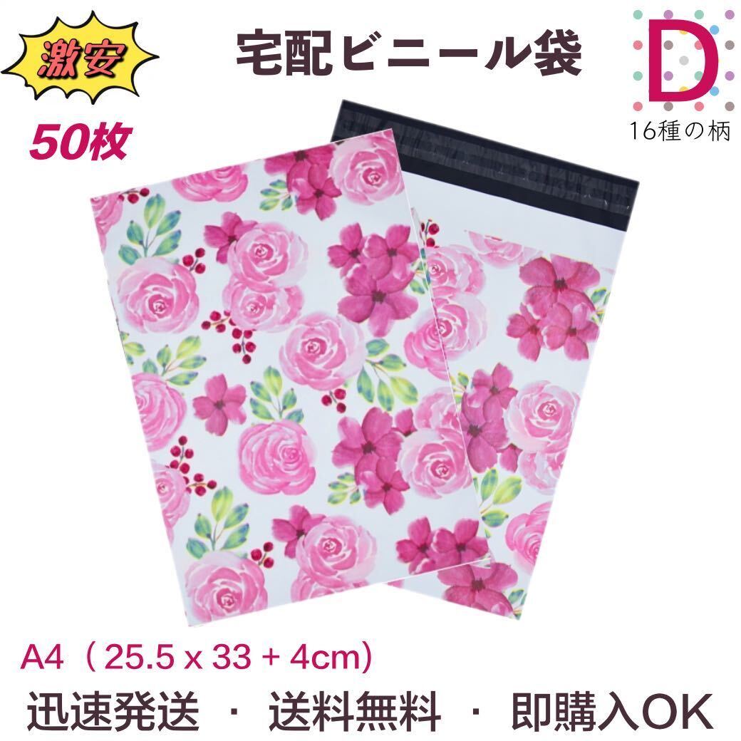 - 宅配ビニール袋 【Dヒンクの薔薇】25.5×33+4cm A4 宅配袋 ポリ袋 梱包袋 ビニール袋 防水袋 梱包資材 テープ付き 袋 50枚 家庭用 業務用