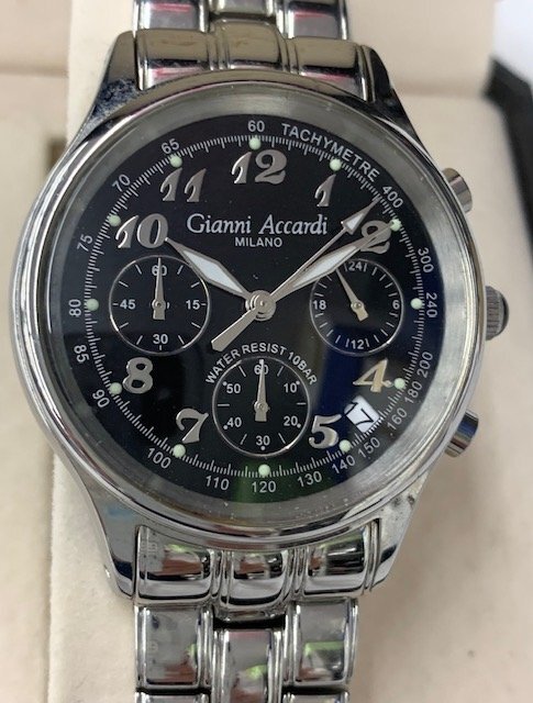 Gianni Accardi MILANO クオーツ クロノグラフ ケースサイズ:35mm(リューズ含まず) ベルト:20cm ラグ:18mm 商品情報 ■ 商品状態:中古品B ■画像のものが全てとなります。
