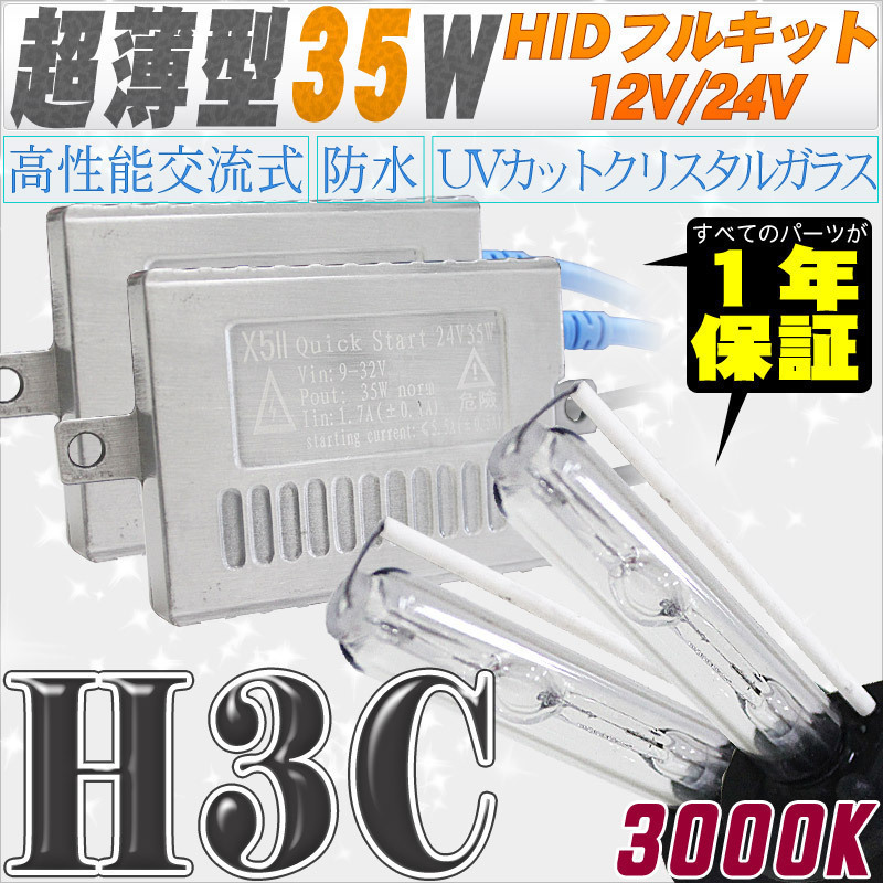- 高性能 薄型HIDキット 35W H3C 3000K 12V/24V 【交流式バラスト&クリスタルガラスバーナー】