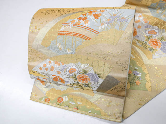 - 《京都一輝堂》【着物】 服部織物 袋帯 六通柄 扇面に鴛鴦 花文 金糸 25b02-197