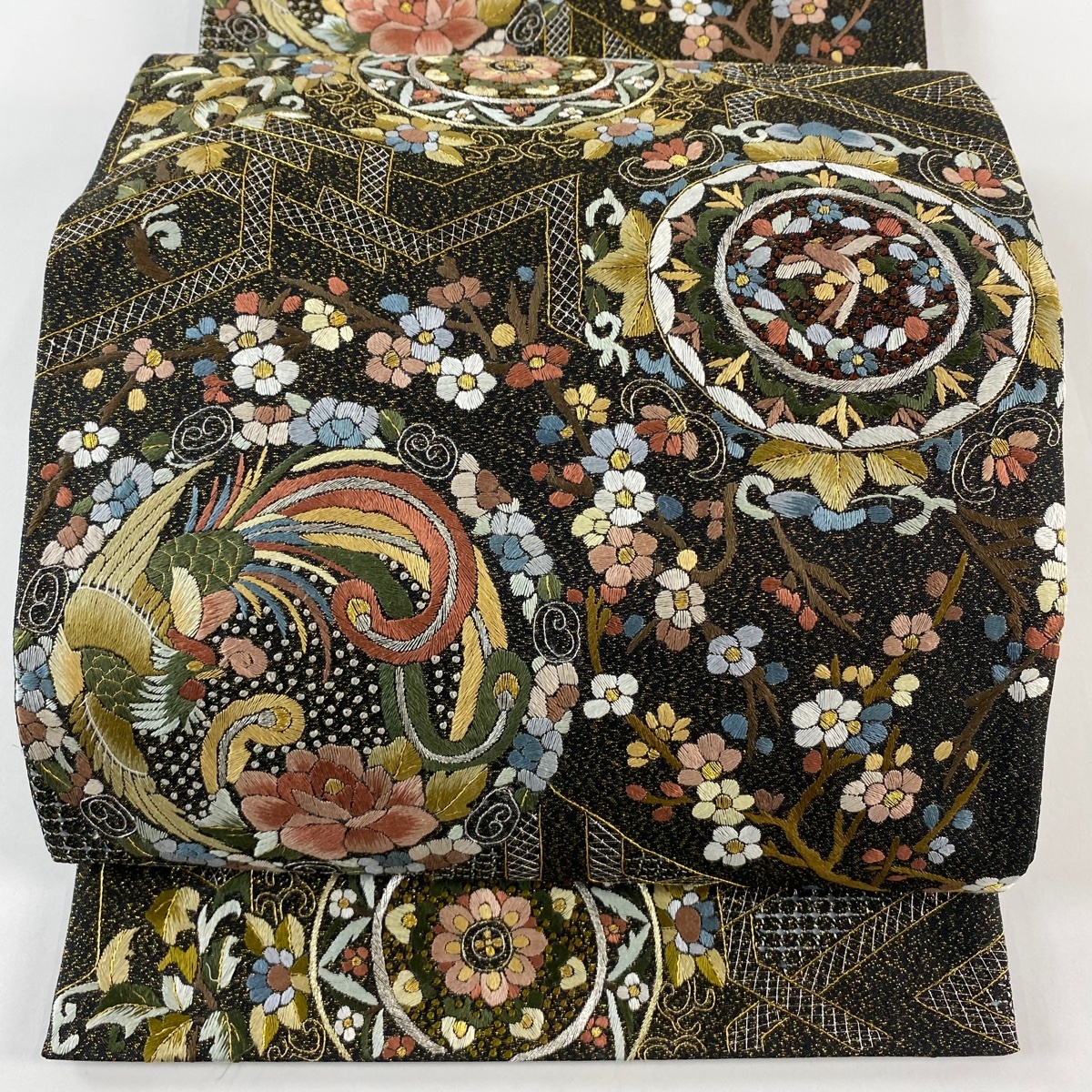 - 袋帯 逸品 華文 花鳥 金銀糸 刺繍 黒 六通 正絹 【中古】
