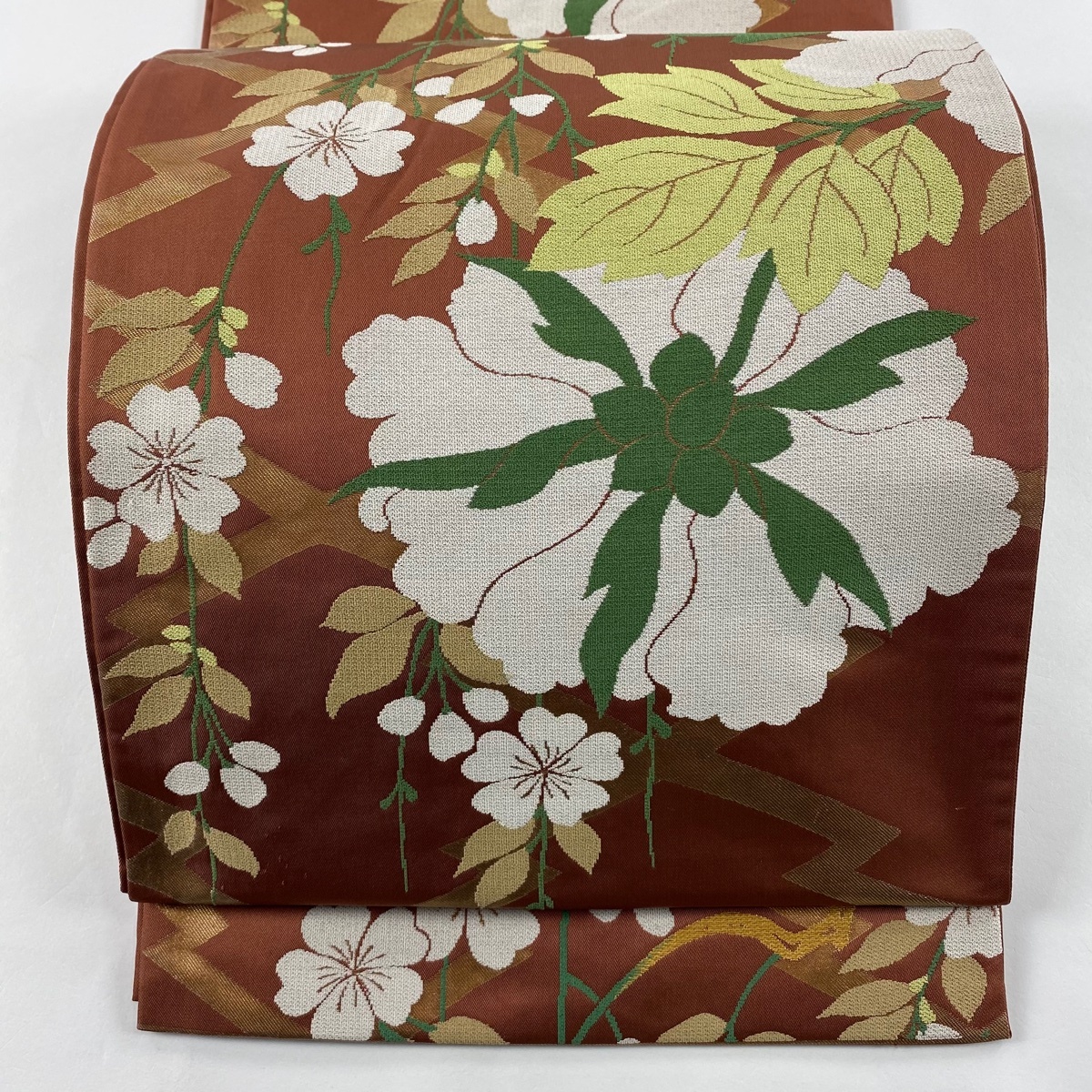 - 袋帯 逸品 辻村ジュサブロー 落款 関西仕立て 桜 松皮菱 茶色 六通 正絹 【中古】