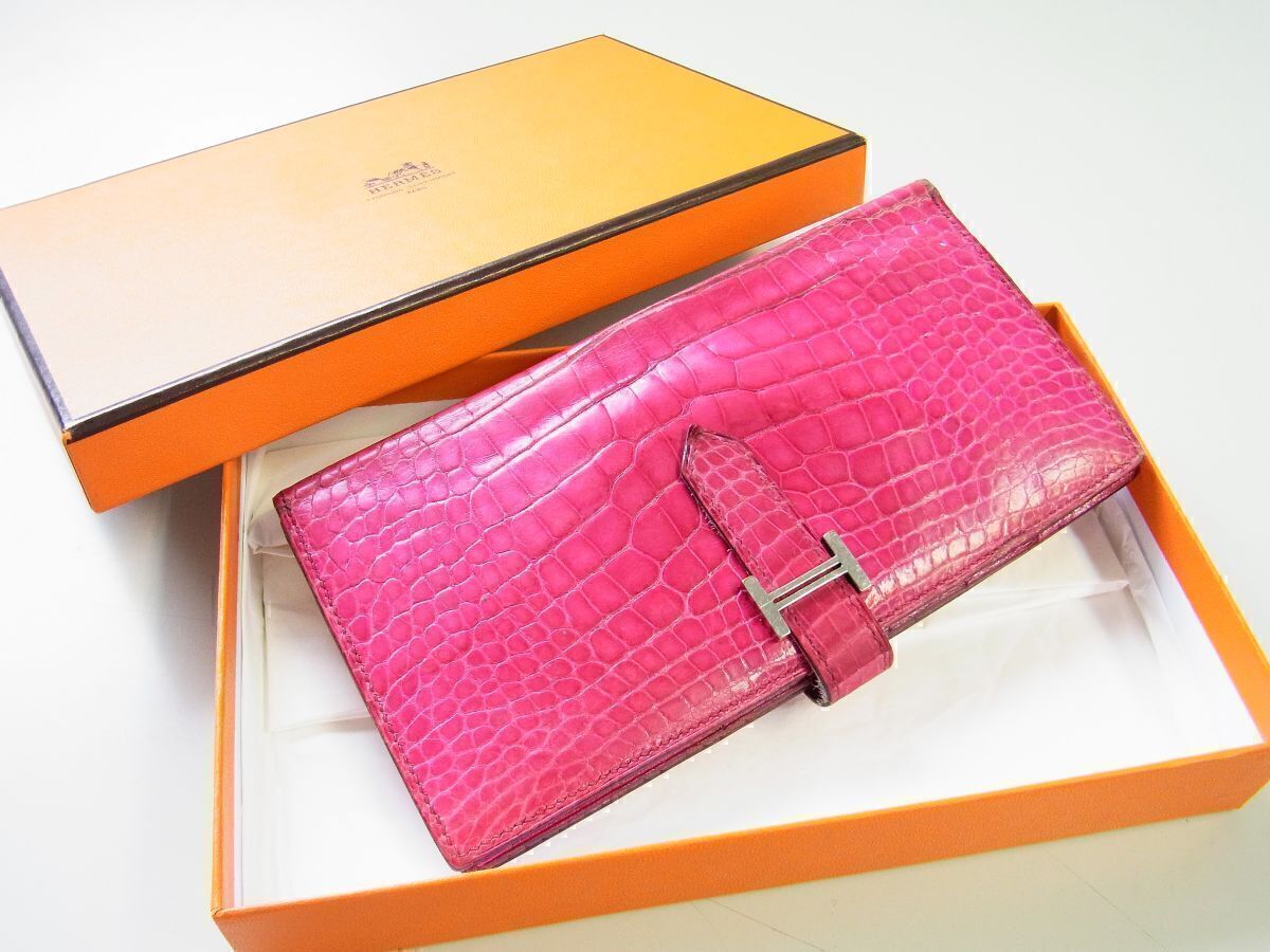 > ★中古 HERMES エルメス★長財布 ベアン アリゲーター★ローズシェヘラザード★クロコ長財布★箱付本物金運★本革クロコダイル【本物保証】