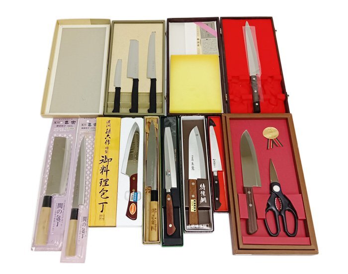 - 包丁 12本 三徳包丁 刺身包丁 菜切包丁 キッチンバサミ まとめて 角馬 濃州孫六作 関一本木作 全鋼牛刀 特殊鋼 堺刀司 濃州正宗 等