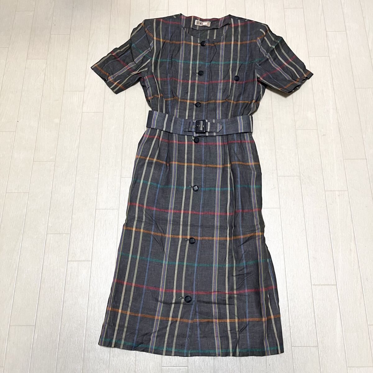 > 和853★ DAKS ダックス 半袖 ロングワンピース チェック ノーカラー 9AR グレー マルチカラー レディース