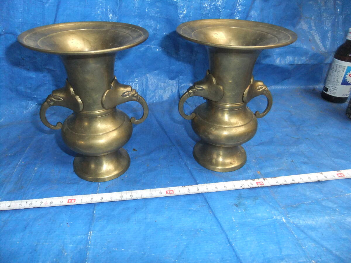 - 寺院用 黄銅製 象鼻耳付き 花入れ 花立 花瓶 仏具 花器 中古品の約1キロ位 2個セット