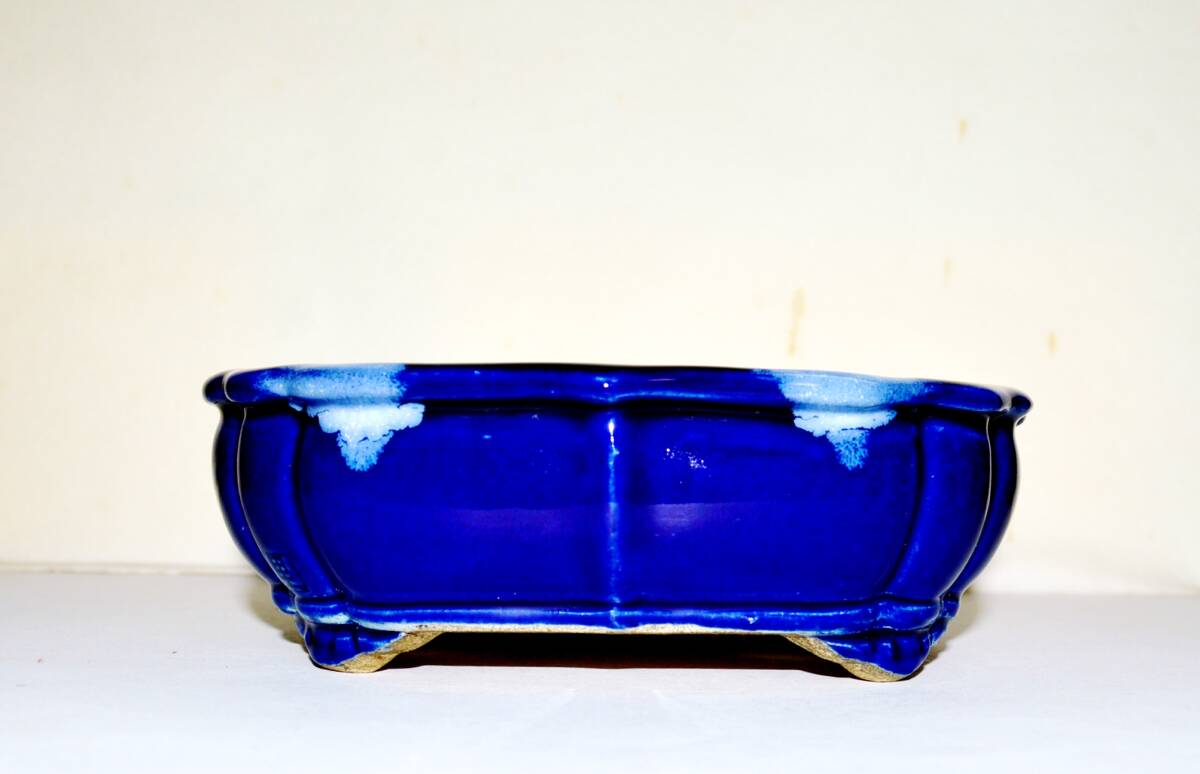 - 人気品薄和鉢作家 「加藤里美(寺畑さとみ)」 氷裂瑠璃釉に白釉 雲足剣木瓜形の鉢