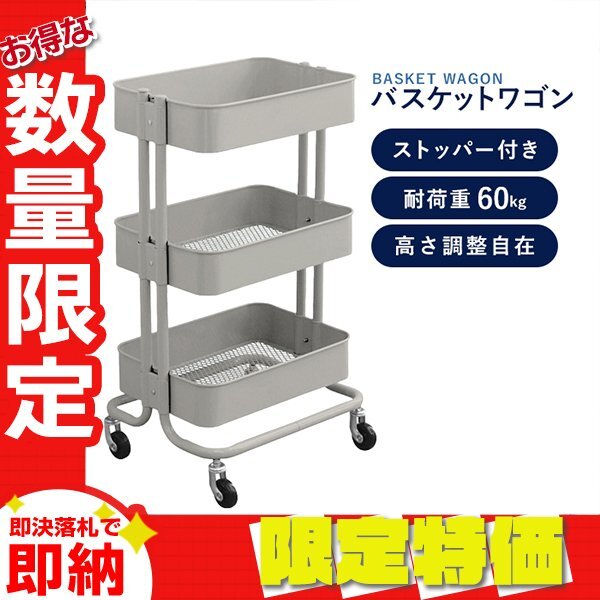 > 【限定セール】バスケットワゴン キッチンワゴン キャスター付 3段 耐荷重60kg 高さ調節 ツールワゴン 多肉棚 メッシュ スチールラック 灰