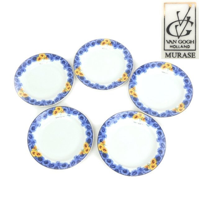 > 【保管品】MURASE VAN GOGH ゴッホ デザートプレート リム皿 5点セット 金彩 ひまわり ブルー 口径約12cm