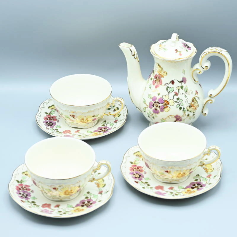 - M05-t030 美品 Zsolnay Hungary ジョルナイハンガリー バタフライ カップ&ソーサー 3客 + コーヒーポット セット