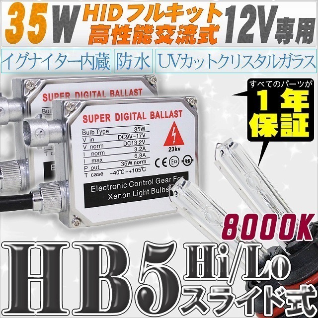 - 高性能 HIDキット 35W HB5 Hi/Loスライド式 リレー付 8000K 【交流式バラスト&クリスタルガラスバーナー】