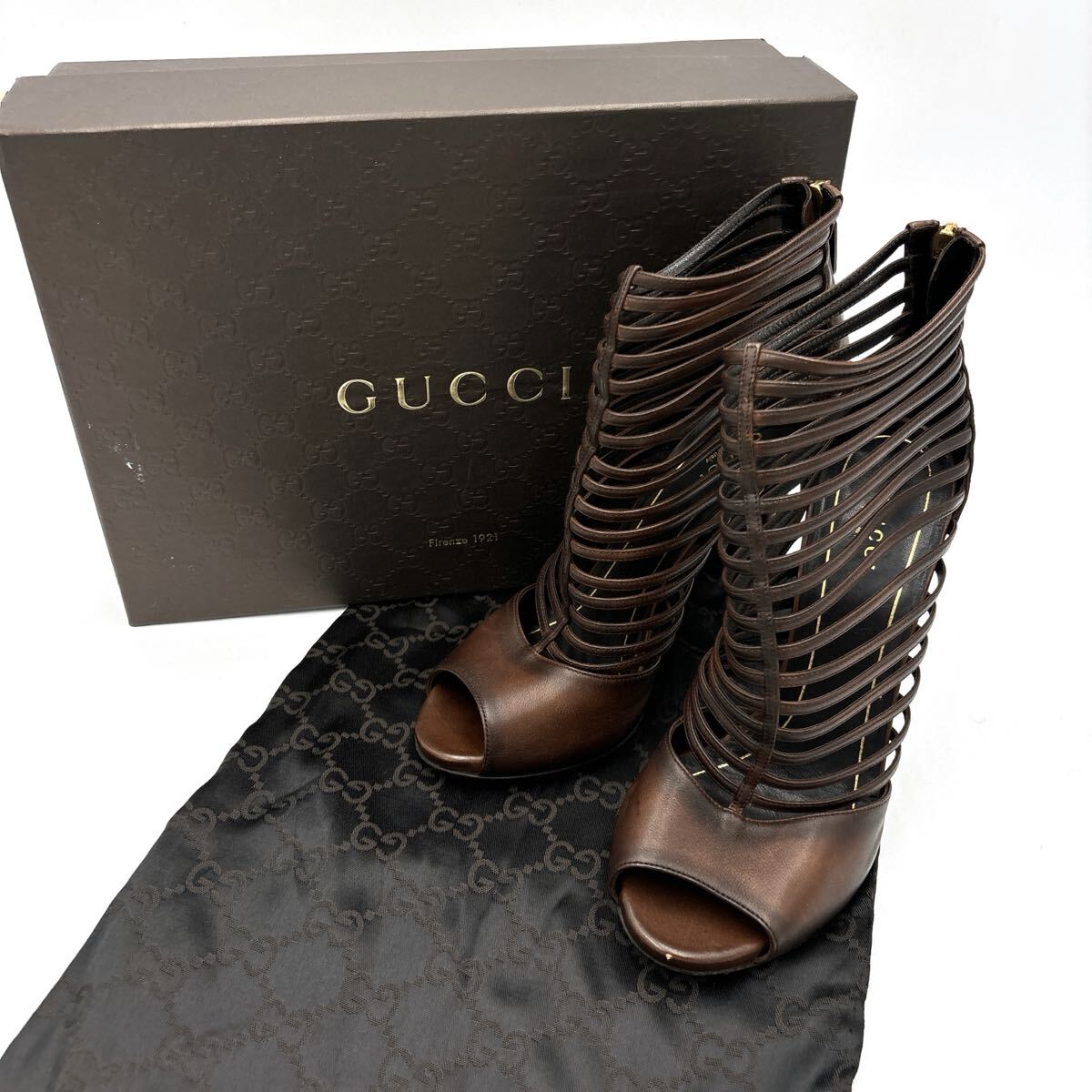 > * 付属品完備 イタリア製 '高級感溢れる' GUCCI グッチ 本革 ヒール サンダル EU38 24cm レディース 婦人靴 シューズ BROWN
