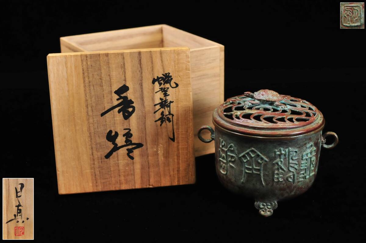 > 【真作】 須賀月真 蝋型鋳銅香炉 亀鶴斉齢 高さ:約10cm 直径:約12cm 重量:664g 共箱 証 03408054-5