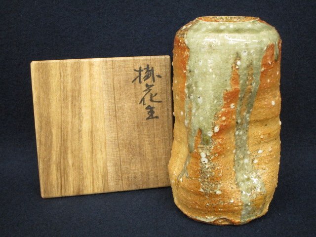 - F2135 陶磁器「金草窯 秦豊秋『掛花生』」刻銘あり/共布/共箱付 陶芸 茶道具 茶陶 華道具 花瓶 花器 花入 一輪挿 フラワーベース