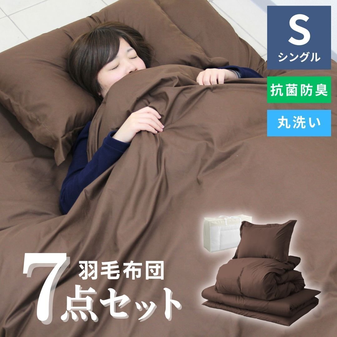 > 【7点セット/シングル】羽根布団セット ブラウン 敷き布団 掛け布団 枕 カバー 寝具 収納袋 1人暮らし 新生活