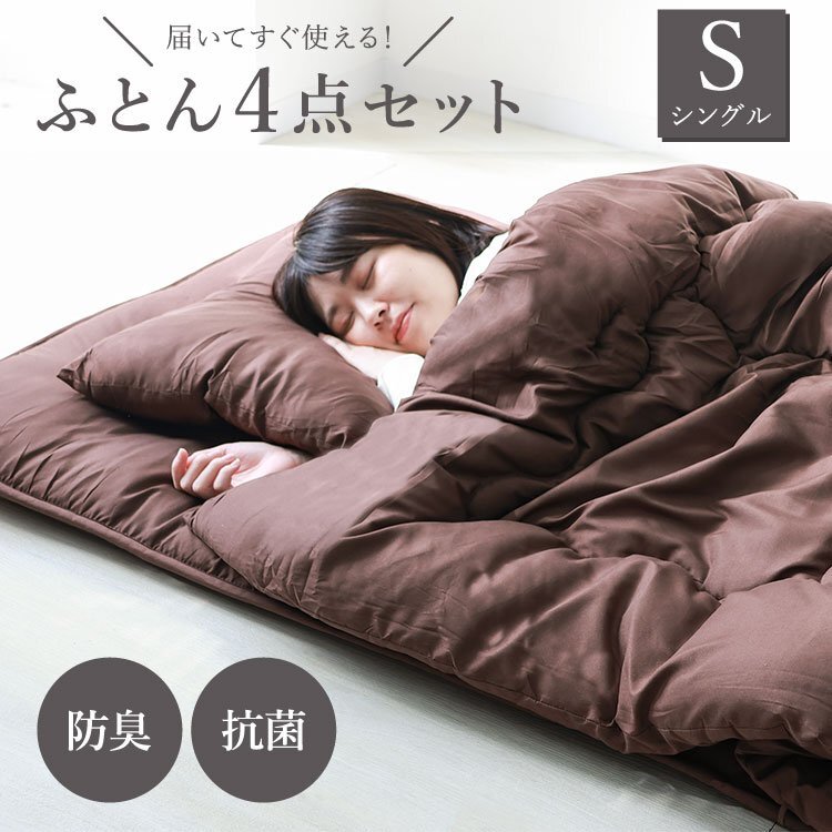 - 布団セット シングル 4点セット 洗える 敷布団 掛布団 枕 抗菌 防臭 防カビ ほこり 出にくい カバー 来客用 収納袋付 寝具 ふとん ブラウン