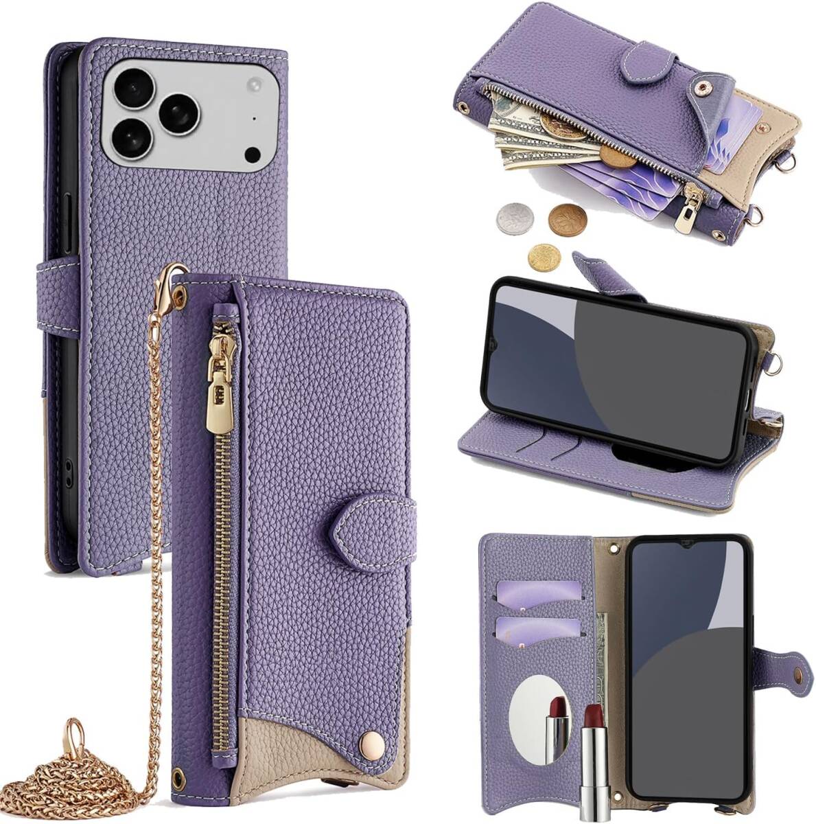 - 【未使用品送料無料】 iPhone 17 ケース 手帳型 ショルダー 17プロ カバー 財布型 肩掛け 横+縦 2掛け方 斜めがけ パープル