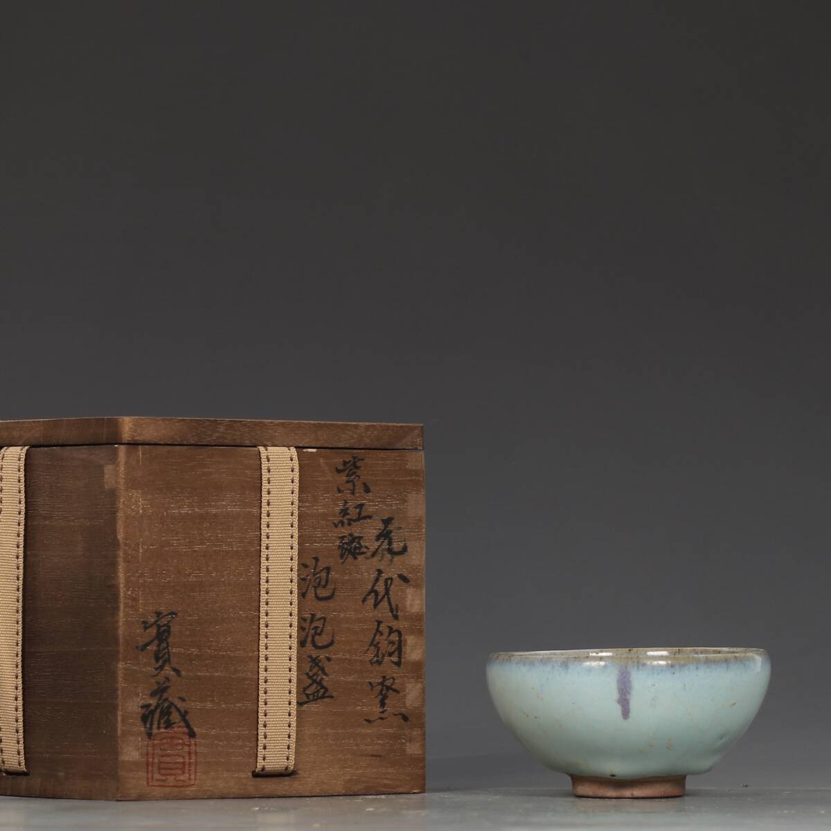 - 元時代 鈞窯 天藍釉 紫紅斑泡泡盞 唐物 箱付き 陶磁器 中国美術 古美術 置物 骨董品 高さ5cm 口径9.8cm RG1175