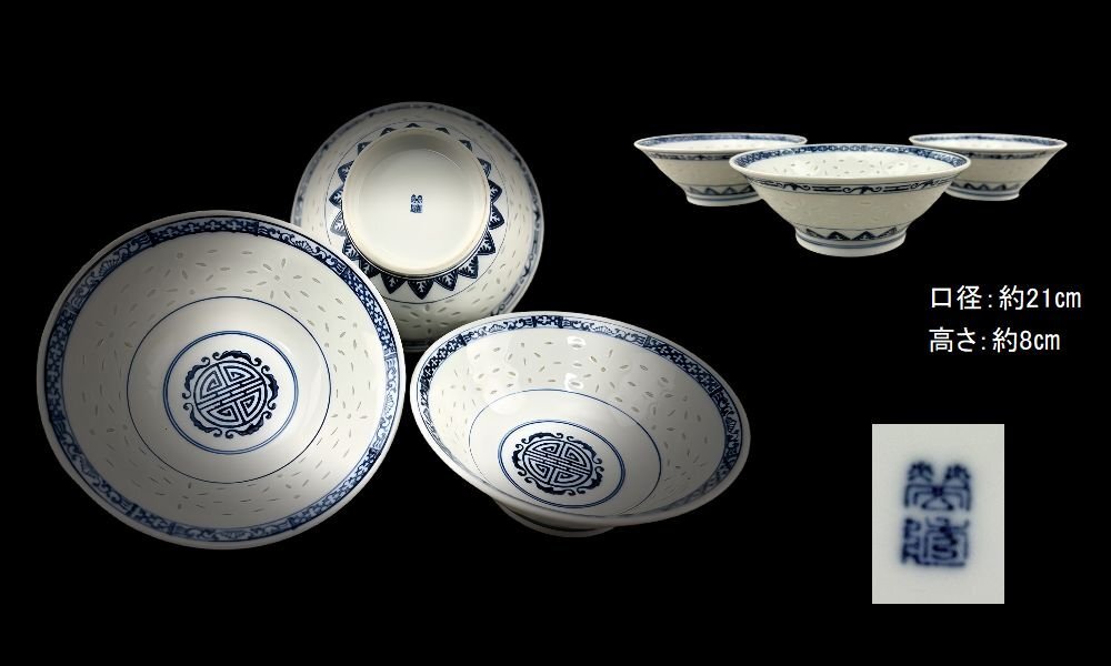 > J1973蛍焼 碗 3点 在銘 寿字蝠文染付絵 口径21㎝ 高8㎝ 中国景徳鎮美術焼物
