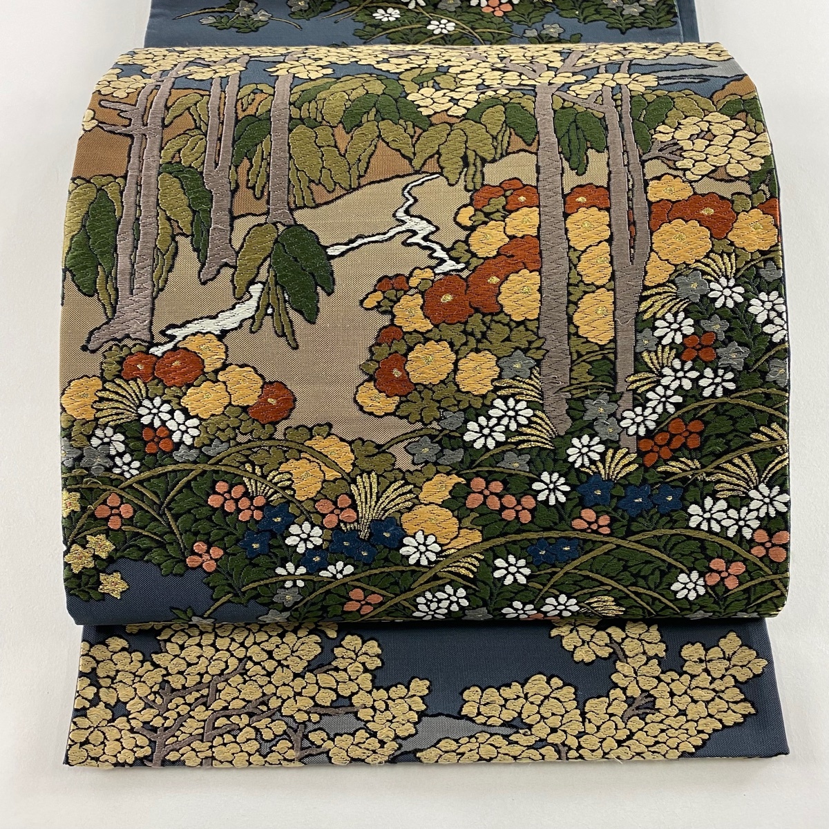 > 【美品】 袋帯 秀品 草花 樹木 金糸 唐織 紺色 六通 正絹 【中古】