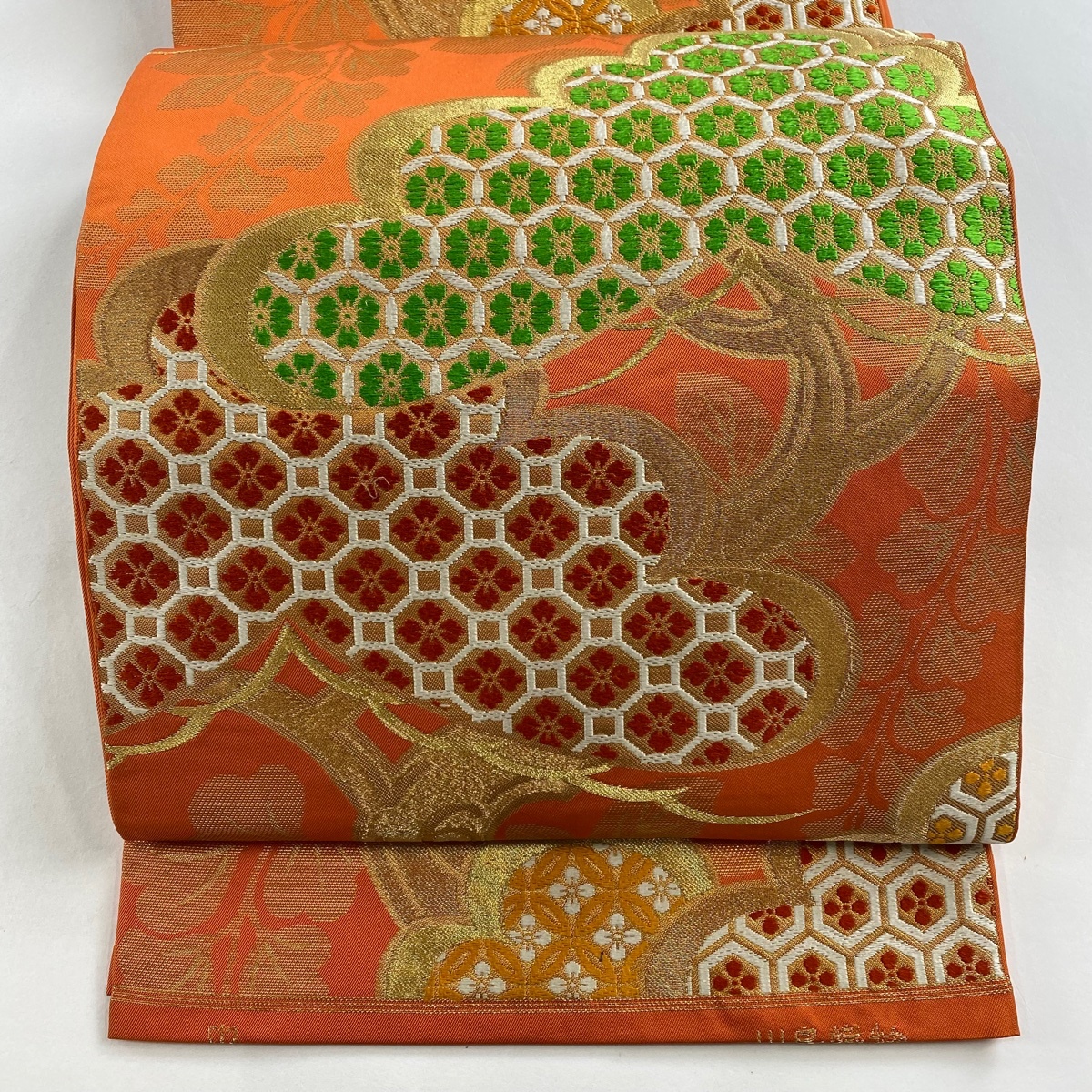 - 【美品】 袋帯 秀品 川島織物 落款 関西仕立て 松 七宝 金糸 刺繍 オレンジ 六通 正絹 【中古】