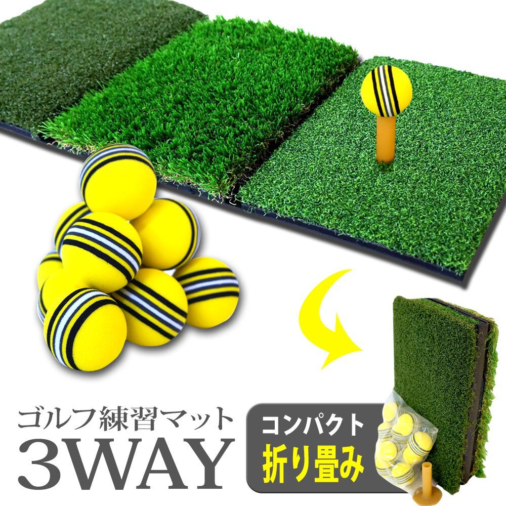 > 3in1 トリプルサーフェス ゴルフマット ゴムT 練習ボール10個付き Tグランド フェアウェイ ラフ ドライバーショット アプローチ XO838