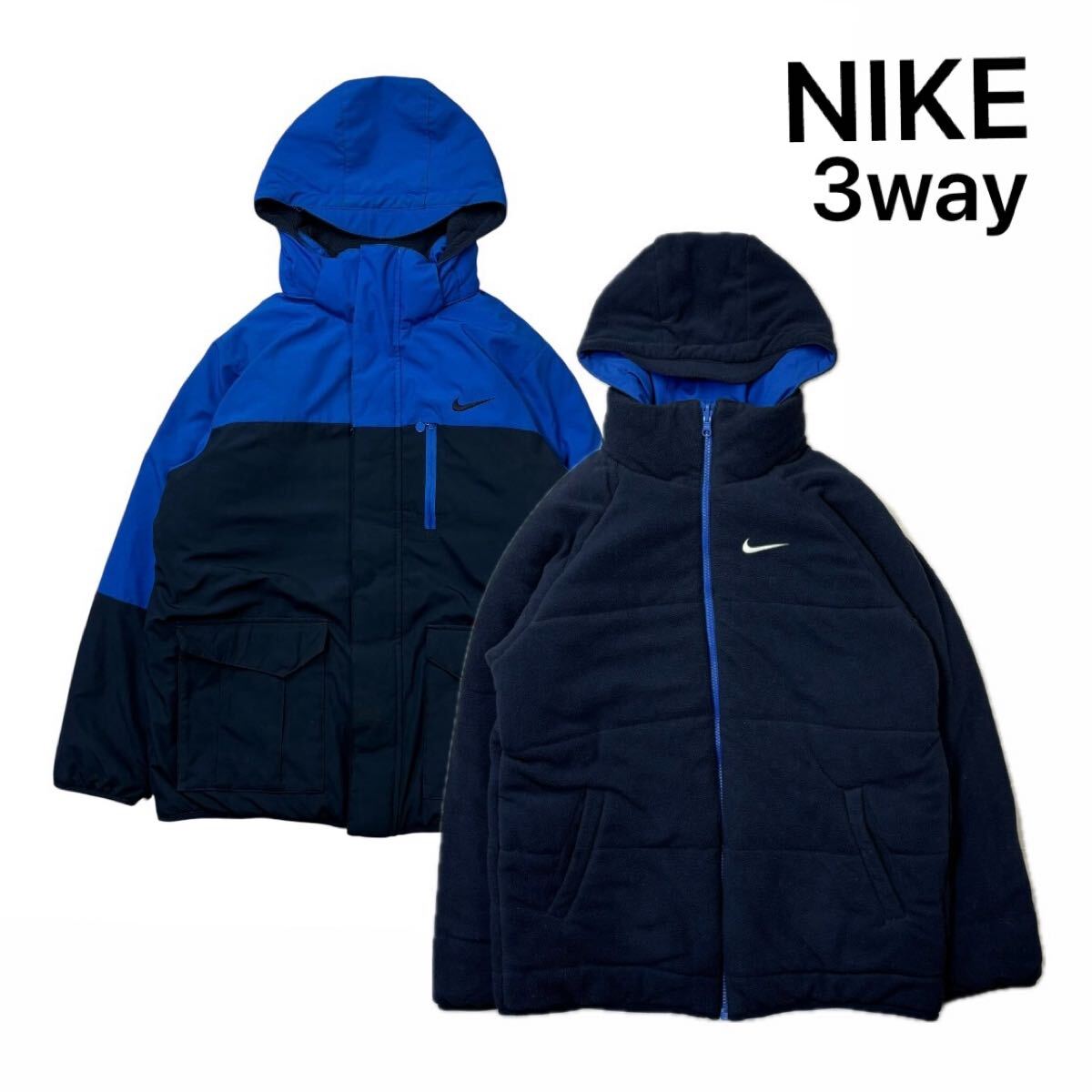 > (KA1008) 3way nike ナイキ リバーシブル 中綿ジャケット アウター フリース ネイビー ブルー ロゴ刺繍 Lサイズ 着脱フード スウォッシュ