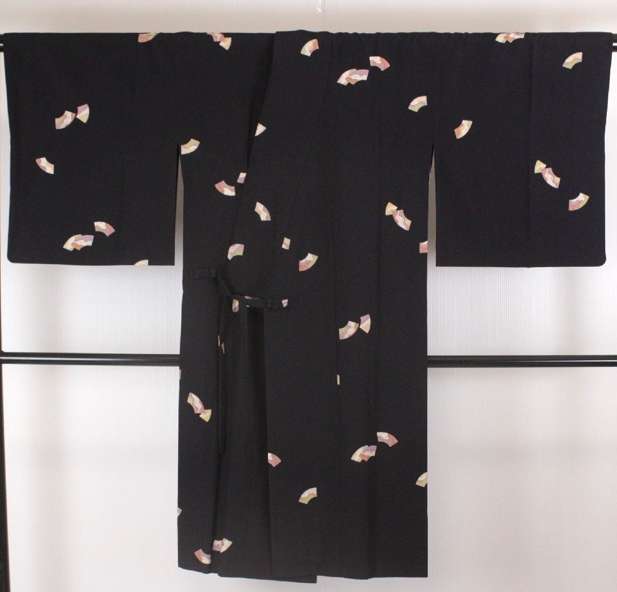 【東京 きもの英】ポリエステル道中着 黒地に扇面文 きもの衿 裄:67.5cm e-2605