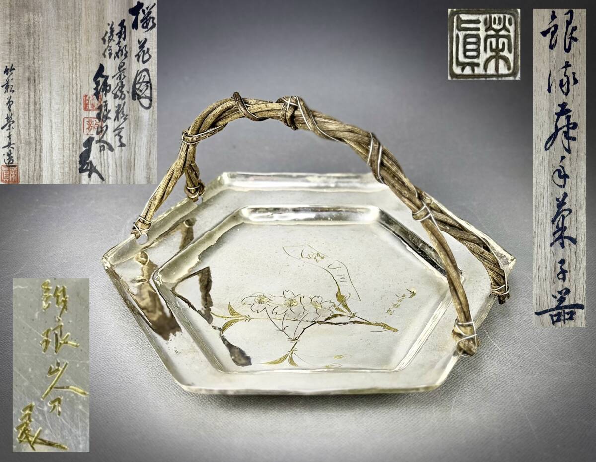 - 【偲】竹影堂栄真 造 純銀 鎚目 三つ桜 桜花図 手つき 菓子鉢 刻印有 煎茶盆 菓子盆 銀製 シルバー j-29