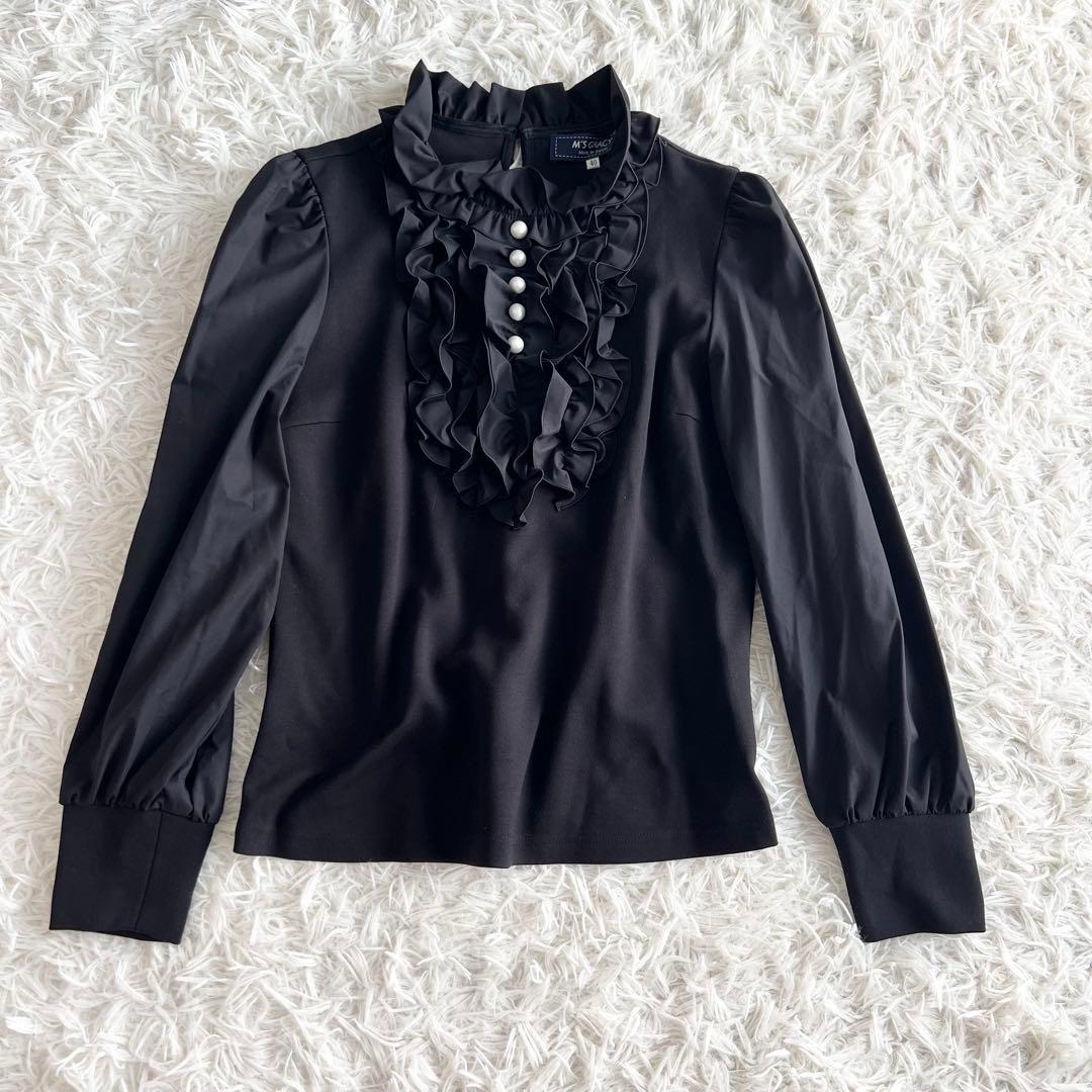 > 24SS 極美品 M'S GRACY エムズグレイシー 異素材ドッキング フリルブラウス ブラック 黒 パールボタン オフィス セレモニー