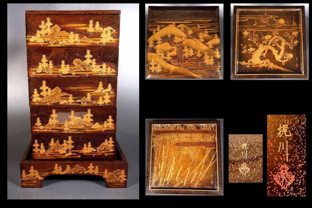 - 【小】5338 江戸期 上質蒔絵の逸品 蒔絵師梶川在銘 金梨地蒔絵山水風景文五段重箱 時代箱有