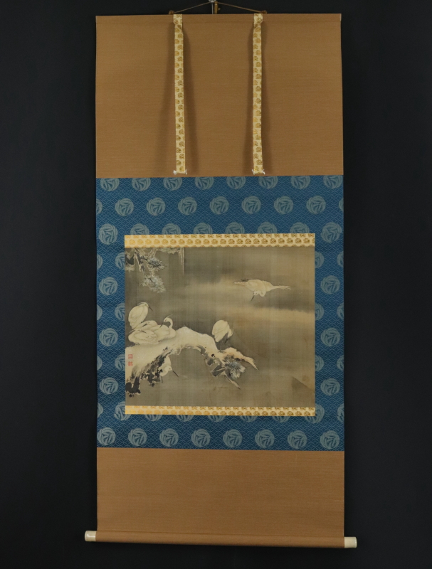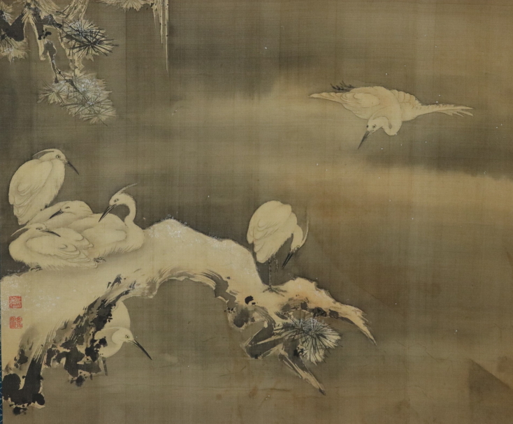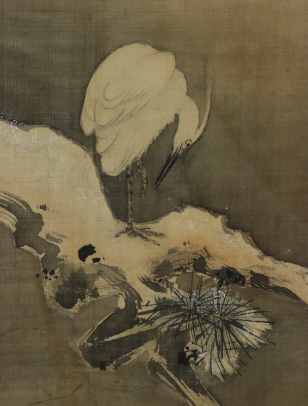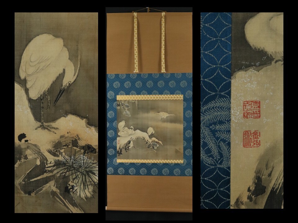 - 11120■【真作】金弘道 松に白鷺図 絹本 肉筆 李氏朝鮮後期の画家 掛軸