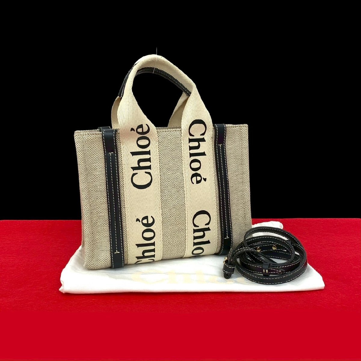 > 極 美品 Chloe クロエ ウッディ スモール トートバッグ キャンバス レザー 2way ハンドバッグ ショルダーバッグ ベージュ ネイビー 41692