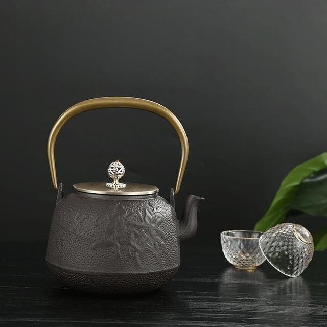 - 鉄瓶 鉄びん 鋳鉄 急須 古風鉄瓶 鉄分補給 提梁壺 茶壺 水壷 煮茶壷 夜間 茶道具 おしゃれ クチナシの花柄