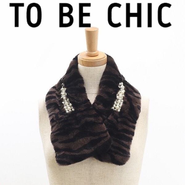> 【FA743】新品◆TO BE CHIC トゥービーシック 1.9万 レッキスラビットファー パール装飾 ティペット マフラー ダークブラウン×ブラック