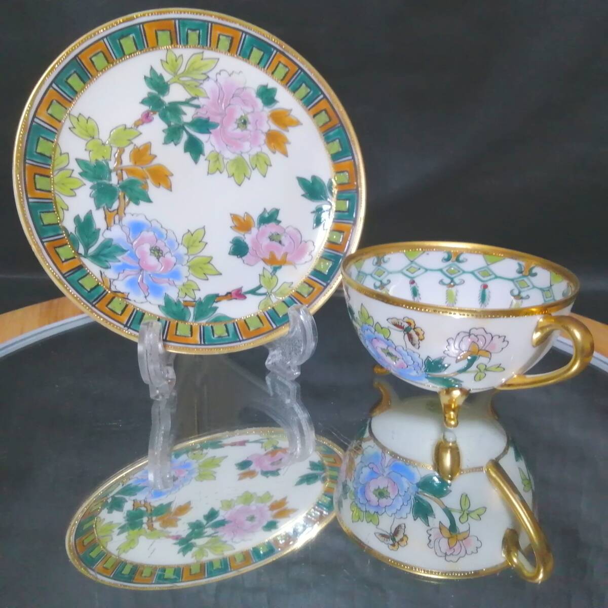 > オールドノリタケ◆里帰り ハンドペイント 中国廣彩風 草花家紋 カップ&ソーサー ペディスティアル