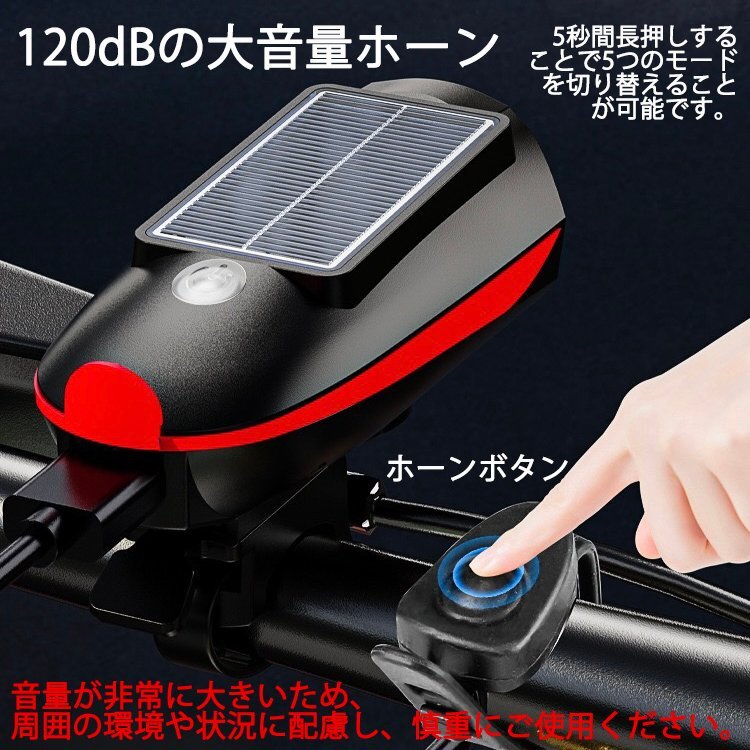 - USB充電 ソーラー充電式 LED自転車ライト ホーン付き バイクライト LEDライト残量表示 自転車ヘッドライト 自転車電子ホーン
