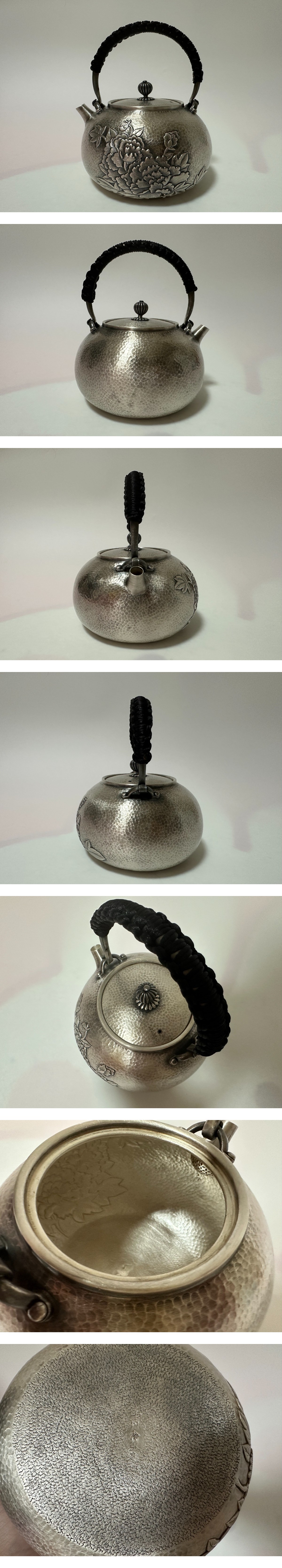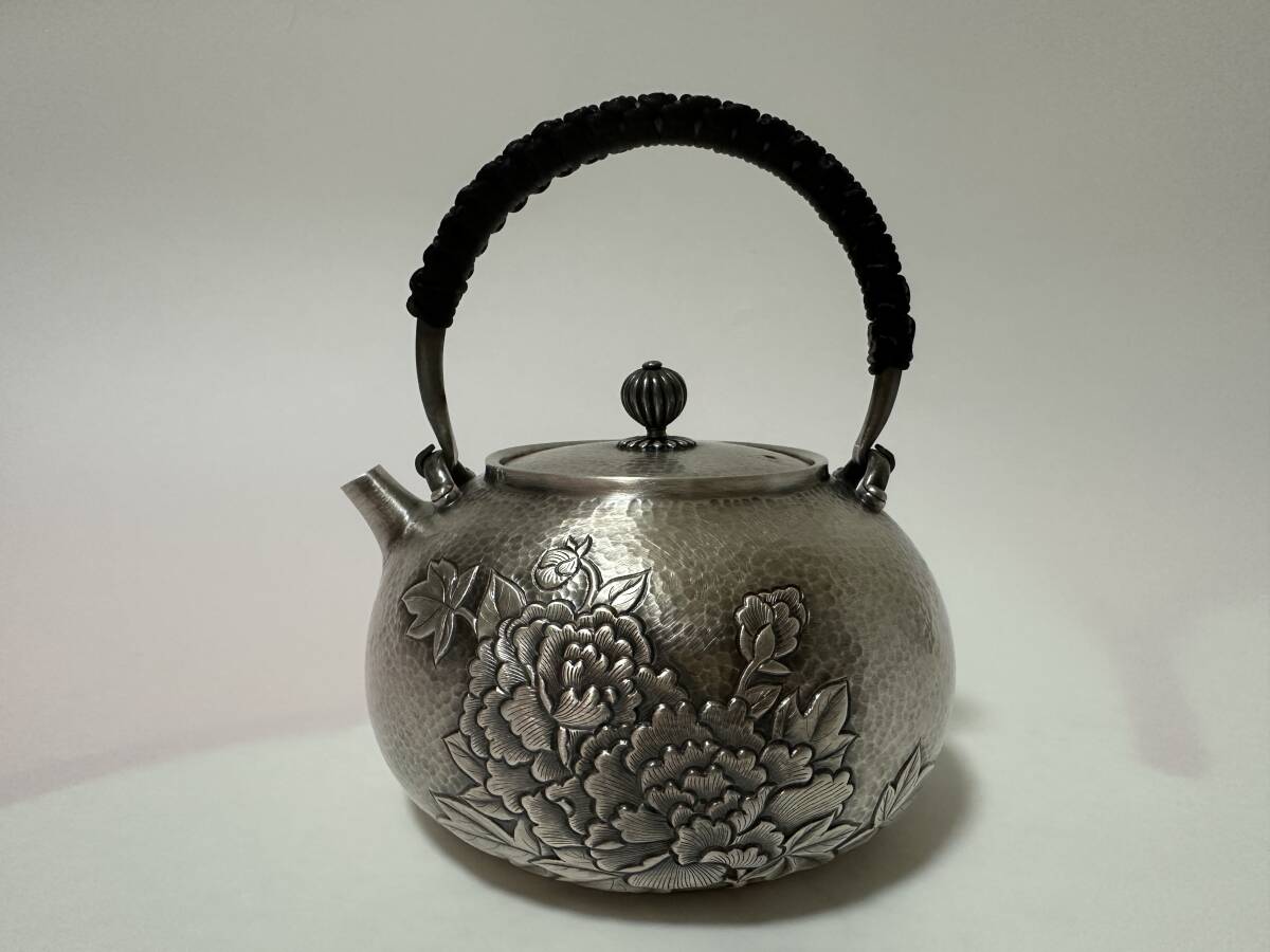 - 時代 純銀製 中川浄益造 牡丹彫り 宝珠形 湯沸 工芸品 古美術品 銀瓶 煎茶道具