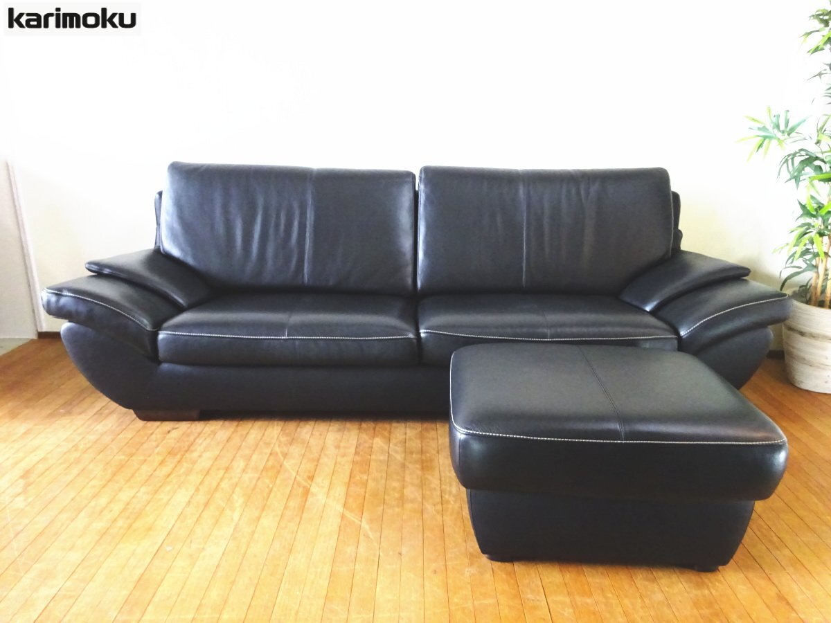 - osk071010 【超美品】 karimoku/カリモク (Chitano/チターノ) 3人掛け・3Pロングソファ 本革/ブラック &オットマン 2点セット