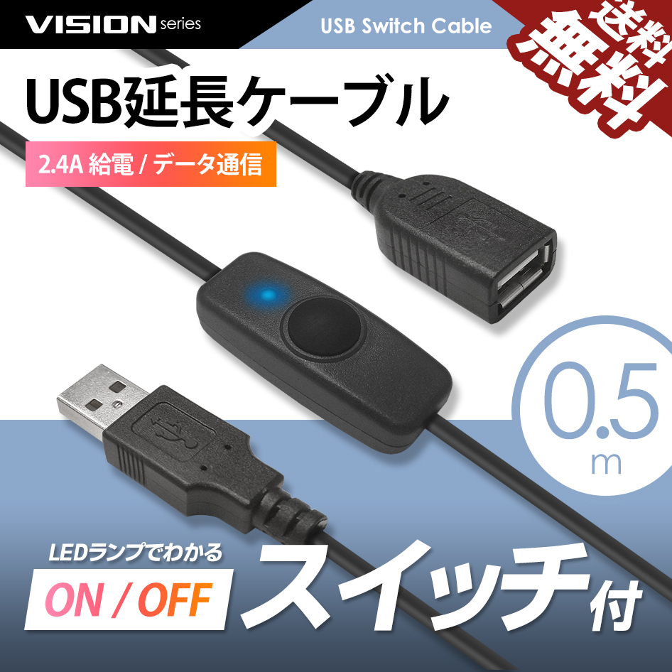 - USBスイッチ付き 延長ケーブル 0.5m 611051 充電 給電 データ通信 2.4A USB2.0 LEDデスクランプ ライト等 ネコポス 送料無料