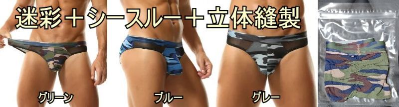 - 【特価】品薄/視線を惹きつけるカッコ良さ!! 迷彩柄シースルービキニブリーフ(S)グリーン