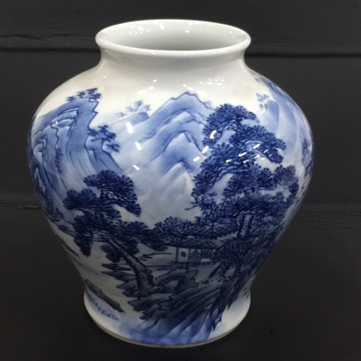 - 1円 銘あり 松右衛門 作 染付山水画 壺 花瓶 直径12cm 高さ約24cm インテリア オブジェ ホワイト×ブルー系 現状品