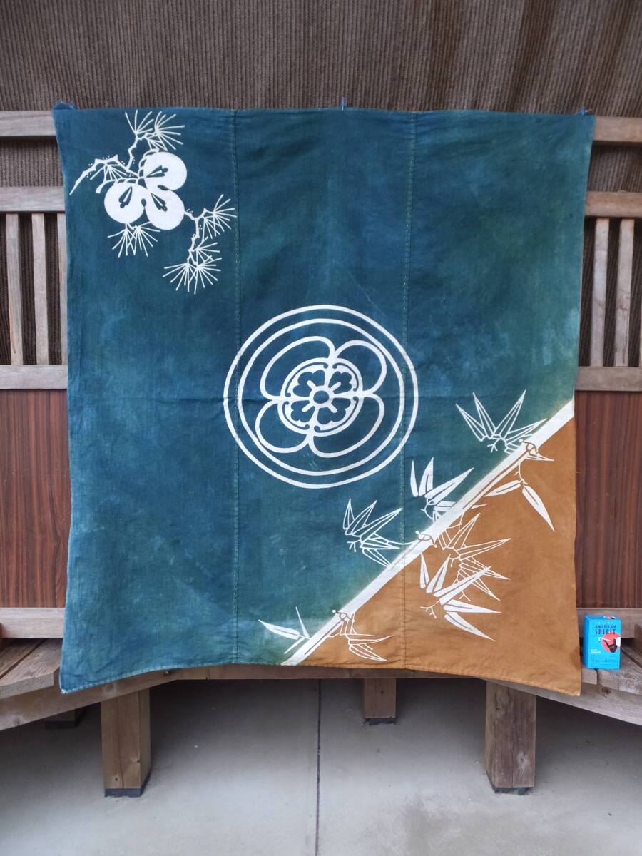 - 使い込まれた緑茶染分け筒描木瓜花菱紋松竹梅文風呂敷古布・3幅繋ぎ・縦109×横幅102㌢・重210g・リメイク素材
