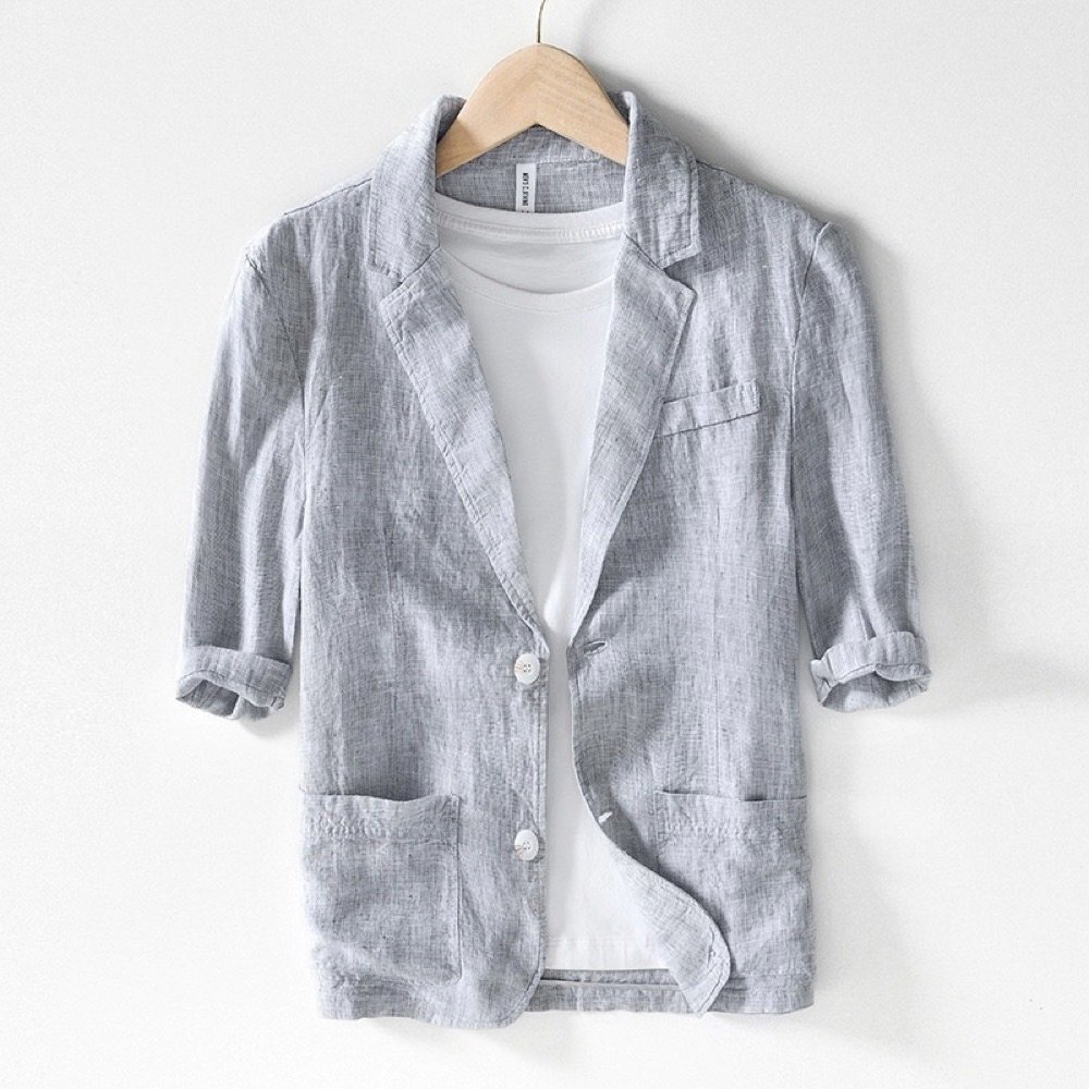 - サマージャケット リネンジャケット テーラードジャケット メンズ ブレザー スーツ 麻 ビジネススーツ 5分丈袖 コート ライトグレー M